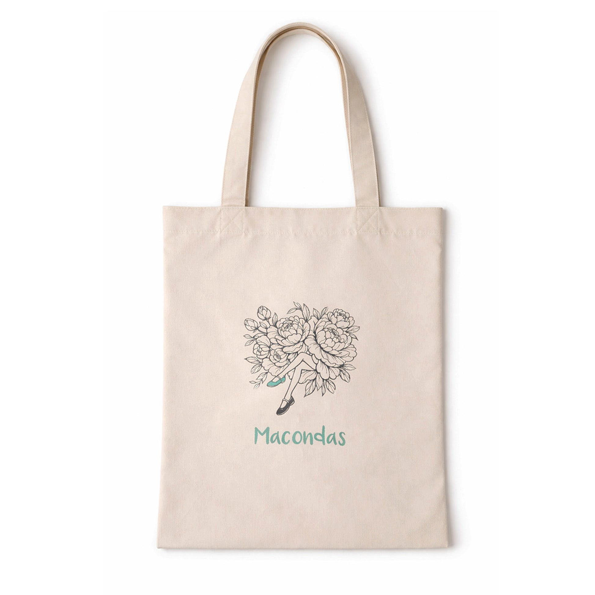 En el centro lleva la ilustración floral Macondas, un diseño delicado que mezcla naturaleza y feminidad, acompañado del logo de la marca. Su tamaño permite llevar cómodamente libros, compras, accesorios o incluso un cambio de zapatos Macondas.