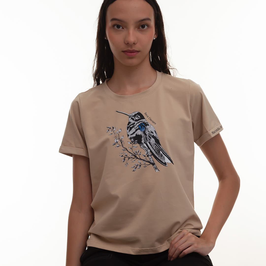 Esta camiseta rinde homenaje al Inca Oscuro, un colibrí nativo de los Andes colombianos. Su figura delicada y su energía vibrante se plasman en una ilustración que resalta la riqueza de nuestra biodiversidad. Ideal para quienes desean vestir con propósito y llevar un pedacito de Colombia en el pecho.
