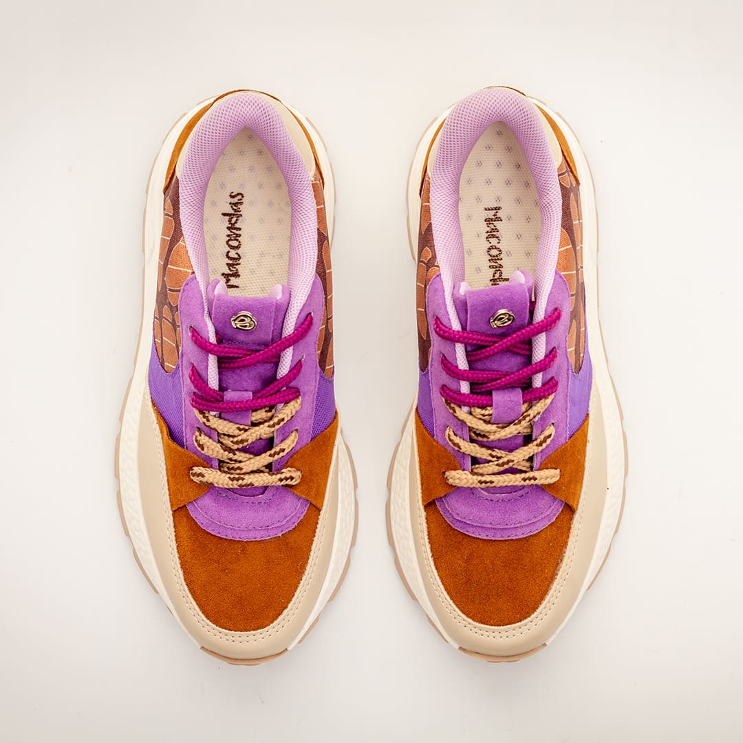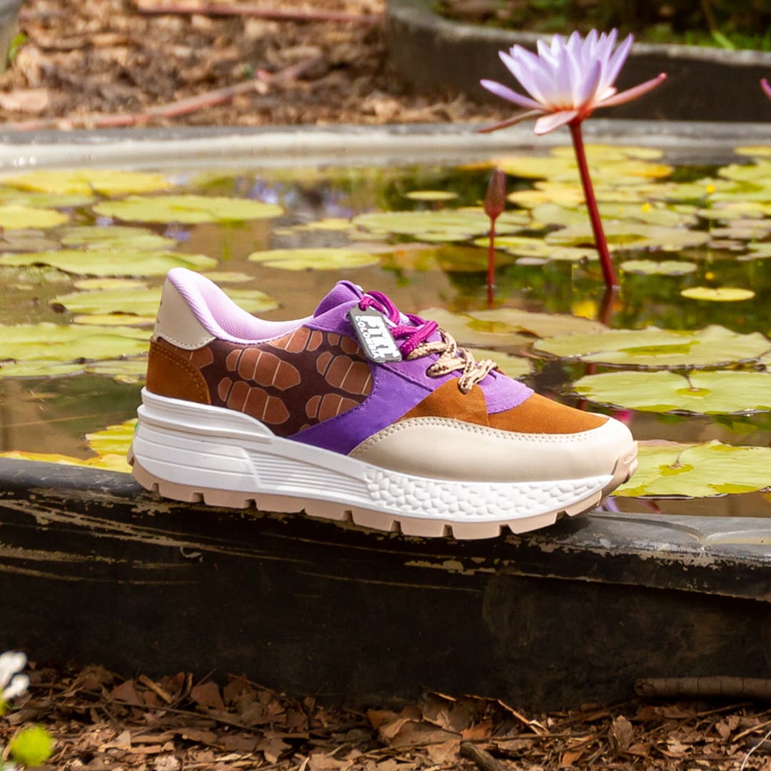 Confeccionado en cuero vegano, textil estampado de autor y suela en PVS Spansor, con una plantilla de alto confort, este modelo une arte y funcionalidad.